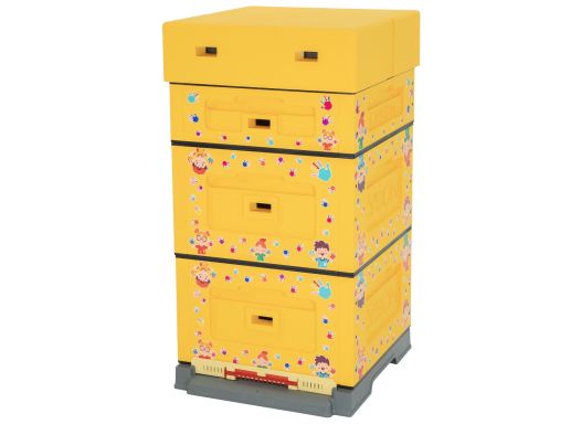 Craquez pour cette ruche décorée de motifs enfantins et naïfs sur un fond jaune soleil. Le motif contraste avec la toile de fond intense !