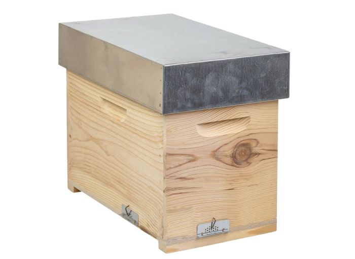 Ce nucléi est fourni avec 2 nourrisseurs doubles, les partitions, couvre-cadres et le toit bois+tôle. En pin maritime d'épaisseur 25mm, assemblage mi-bois.