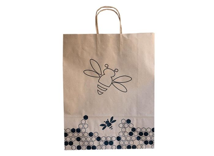 Professionnels : Le sac en papier kraft, respectueux pour la planète, est idéal pour votre boutique. Tout en élégance, les alvéoles aux traits simples sont imprimées vers le fond du sac. Le noir profond de l'encre fait ressortir parfaitement le design sur la couleur du papier carton.< /br> Amateurs : vous souhaitez offrir des produits de la ruche à vos proches ? Le sac papier en kraft est parfait pour emballer vos présents simplement et coquettement.