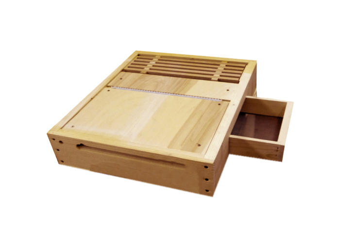 Cette trappe à pollen a été étudiée avec minutie afin d'obtenir un pollen plus propre. Elle se compose de deux parties : un blocage de l'entrée de vos abeilles (qui laissera tout de même la possibilité aux faux bourdons de sortir) et un couvre-cadres trappe à pollen qui vous permettra de stocker votre pollen. La trappe n'empêche pas l'accès de vos abeilles entre le corps et la hausse.