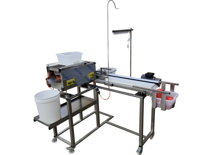 À la sortie, un système de soufflerie sépare les poussières et des parties volatiles comme les ailes d’abeilles et autres résidus. Le pollen s’écoule alors dans les 2 bacs récepteurs, le plus propre dans le premier bac et le reste dans le second.