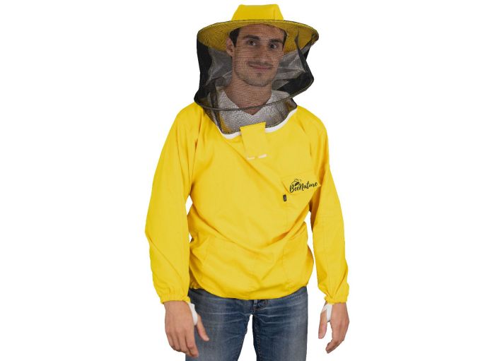 Cette vareuse jaune à chapeau rond amovible propose toute la sécurité nécessaire au bon déroulement d’une visite au rucher.