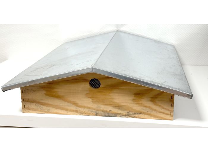 Structure en pin maritime, recouverte de tôle galva. Ventilation à l'avant et à l'arrière. Dimensions : Toit tôle : 610 x 480 mm Dimensions externes : 400 x 540 x 20 mm Dimensions internes : 370 x 510 mm Epaisseur bois : 20 mm