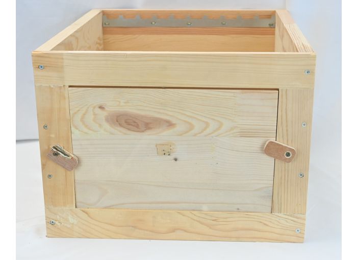 Corps de ruche Dadant 10 en épicéa, assemblage mi-bois, équipé d'une vitre en plexi pour observer tranquillement le travail des abeilles sans les déranger.