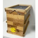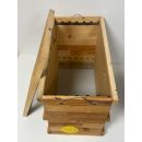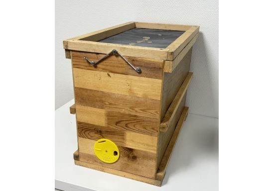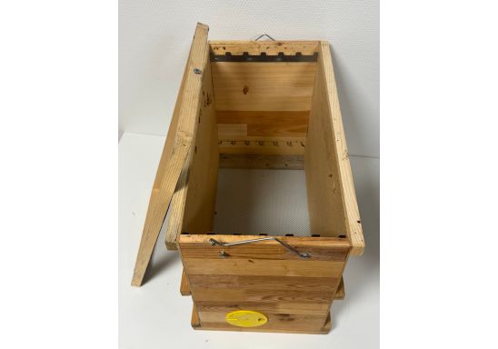 Ruchette d'occasion au format Dadant 6, entièrement ventilée au fond, avec toit grillagé, équipée d'une entrée ronde et de fixe-éléments. Traitée à l'huile de lin, parfait état.