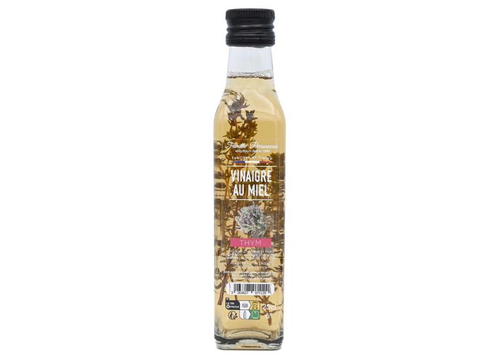 Le vinaigre au thym et au miel conçu en France, à partir de produits naturels, propose un goût prononcé et raffiné.
